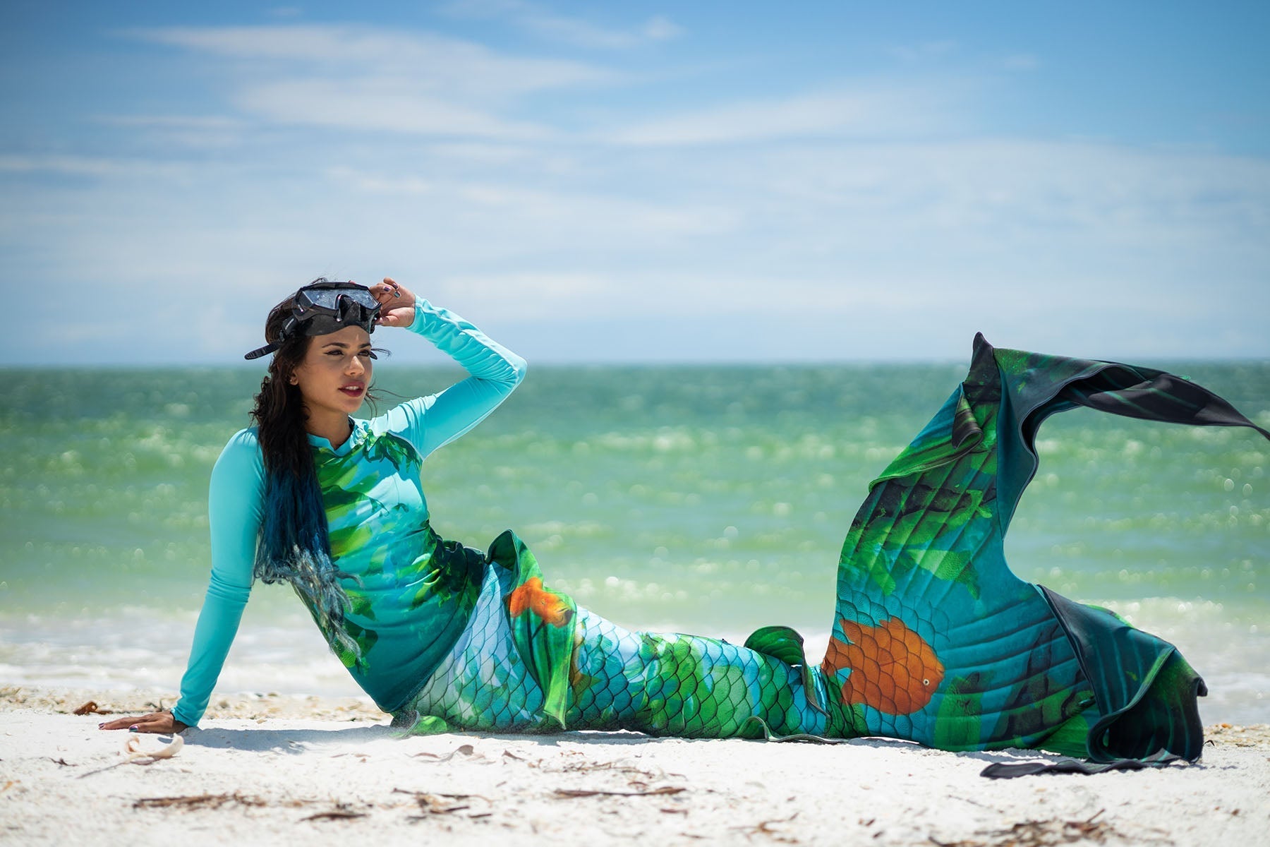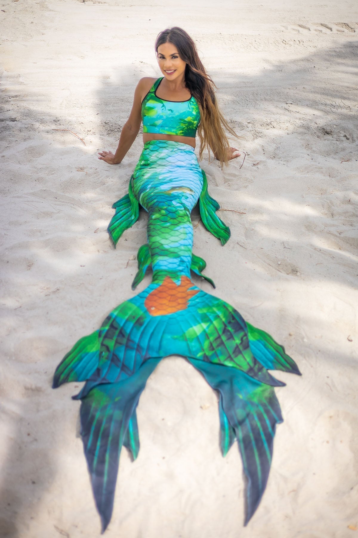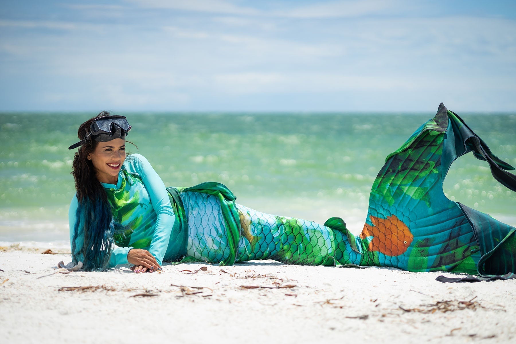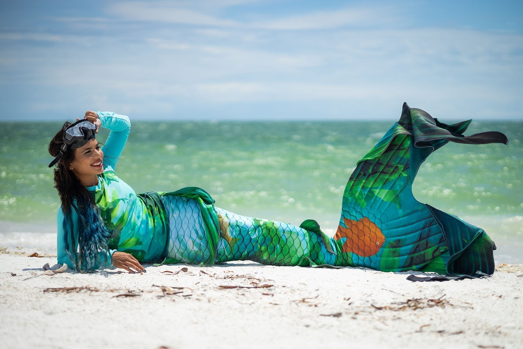 This beautiful Mermaid Tail celebrates the uniqueness of our California Coast with the Kelp Forest and the California Garibaldi state fish.