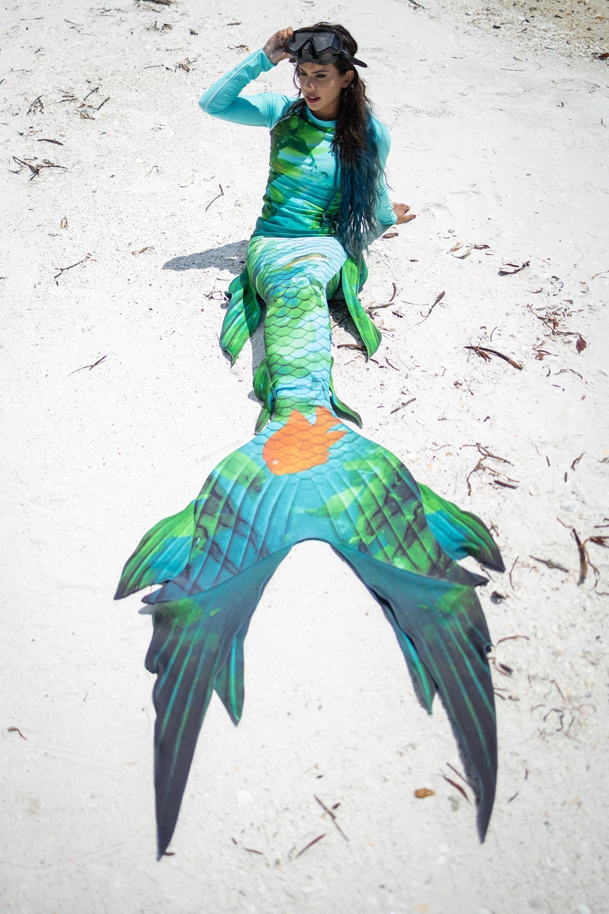 **Please take care when using your mermaid tail! Pebble Tec pools, pool decks, rocks, and rough surfaces can damage the print and/or fabric. Cape Cali cannot be responsible for tails that have holes or rips due to misuse**