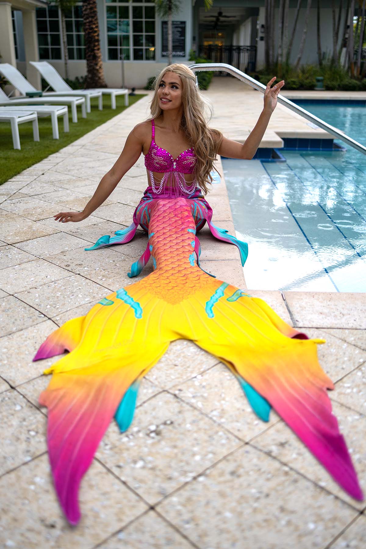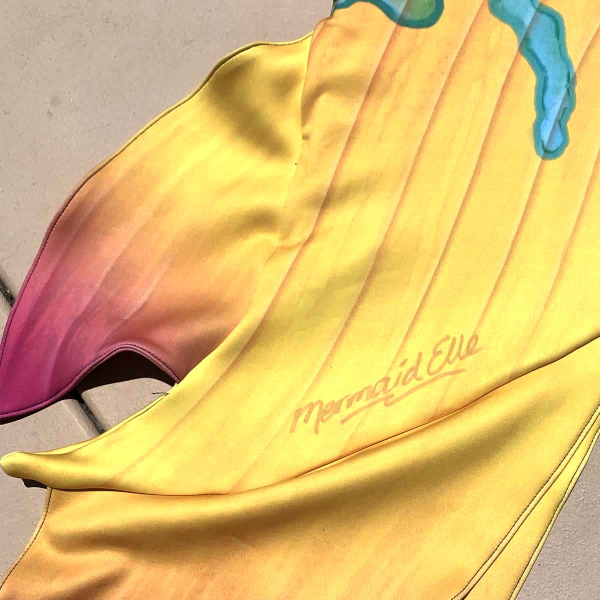 **Please take care when using your mermaid tail! Pebble Tec pools, pool decks, rocks, and rough surfaces can damage the print and/or fabric. Cape Cali cannot be responsible for tails that have holes or rips due to misuse**